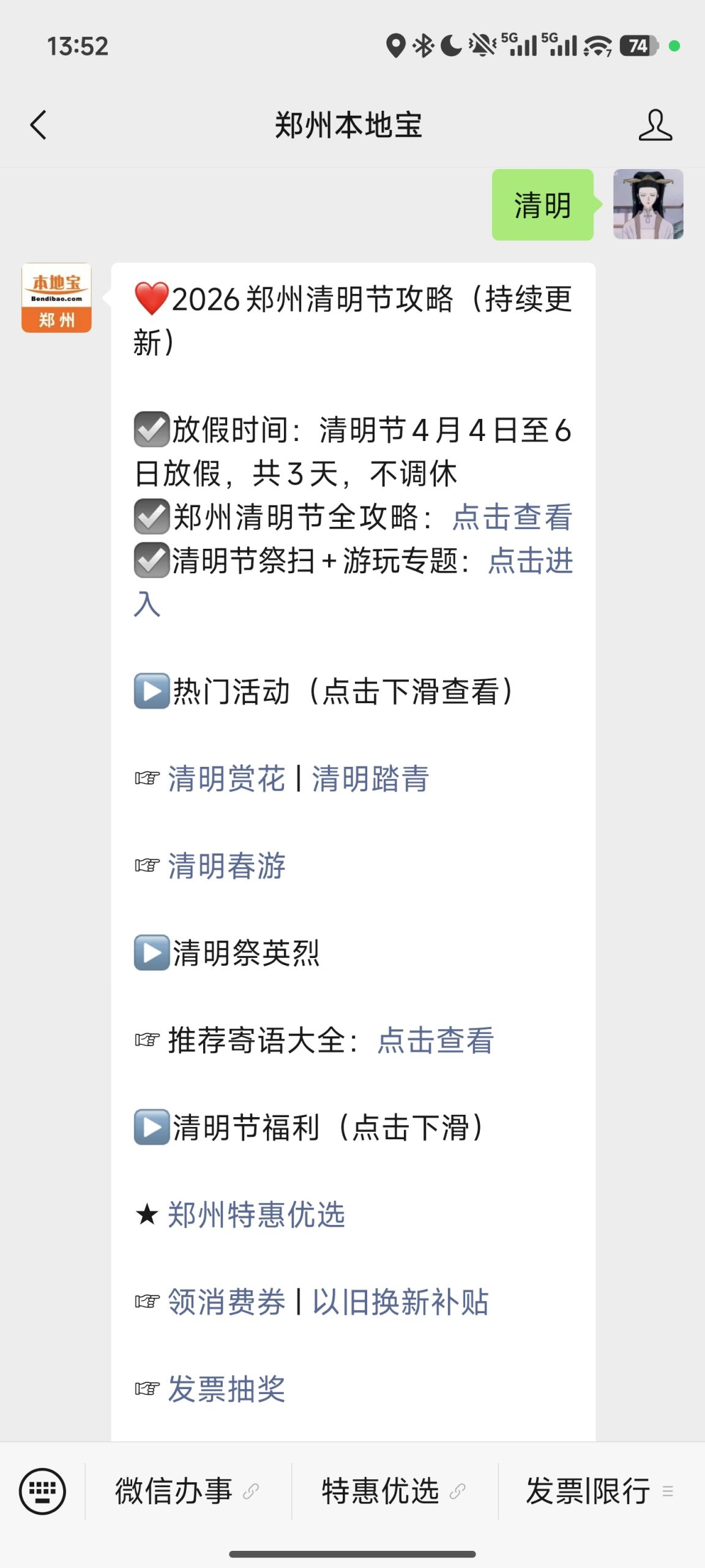 温馨提示:微信搜索公众号【郑州本地宝】,关注后回复【清明】查看2026年郑州清明节游玩祭扫全攻略,包括最新放假安排、各种好去处推荐(赏花+踏青+爬山)、热门景区活动、免费高速政策、祭扫指南等(持续更新)