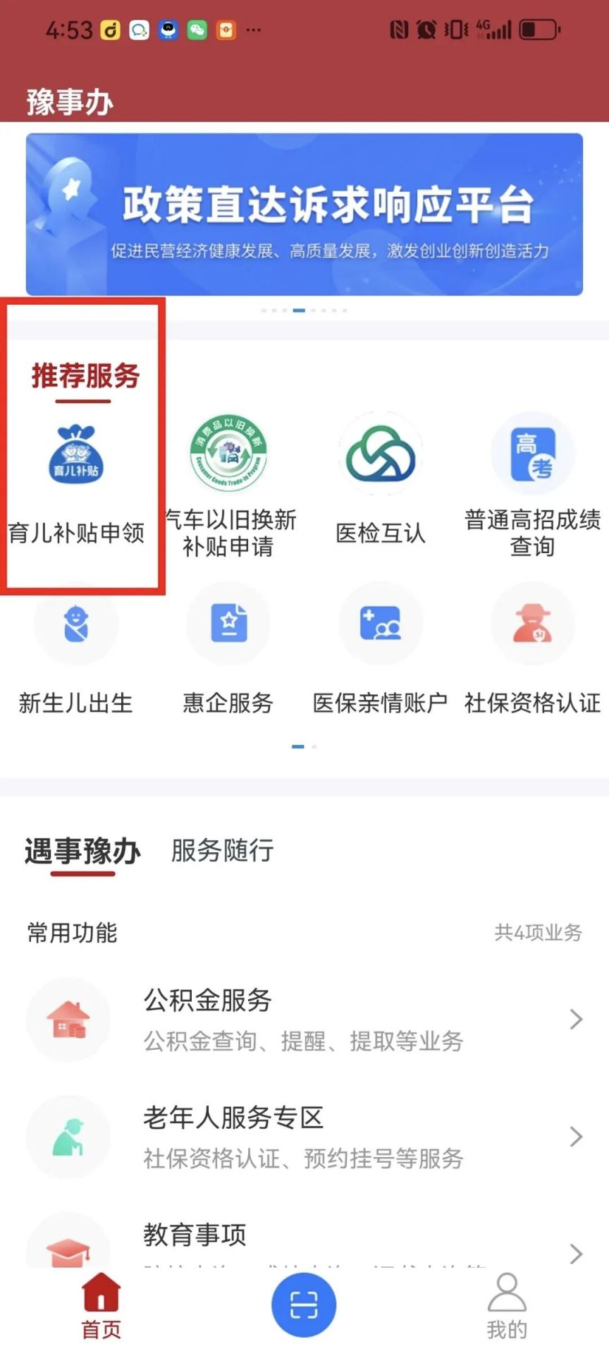 河南的宝爸宝妈请注意,“豫事办”(安卓、苹果、鸿蒙版App,以及支付宝小程序)已正式开通育儿补贴申领,您可以登录“豫事办”,点击首页“育儿补贴申领”,按照要求上传材料进行申领。
