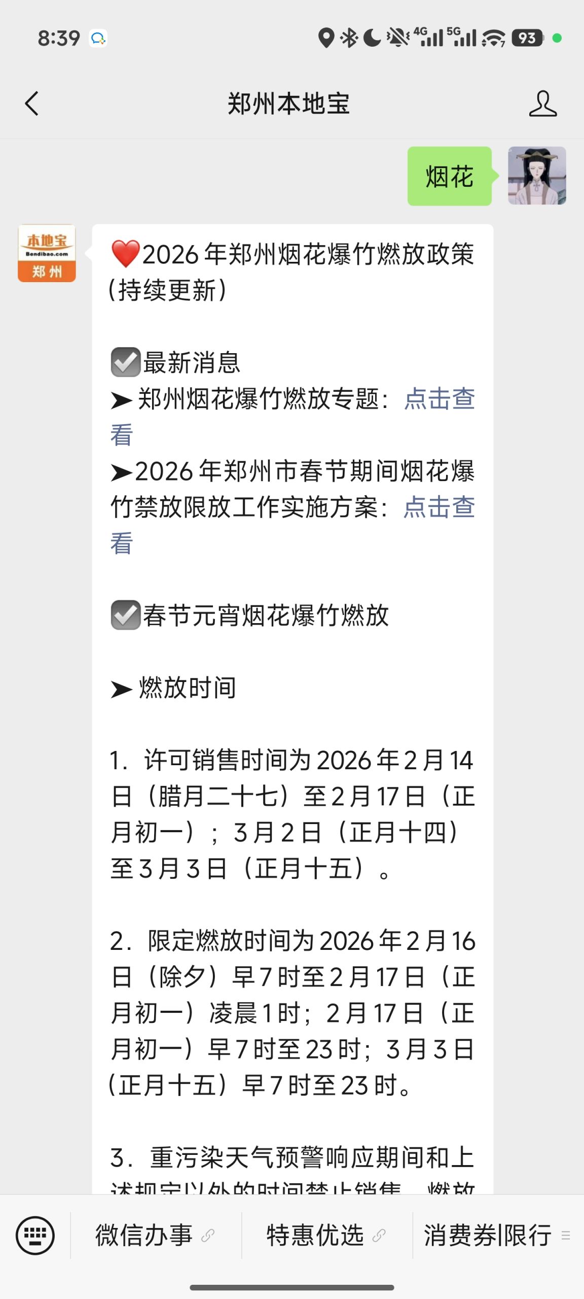 温馨提示:微信搜索公众号【郑州本地宝】,关注后回复【烟花】获2026年河南及郑州烟花爆竹燃放规定,包括最新禁燃禁放消息、春节元宵燃放规定、禁放及可燃区域、烟花爆竹经营许可证办理指南等(持续更新)