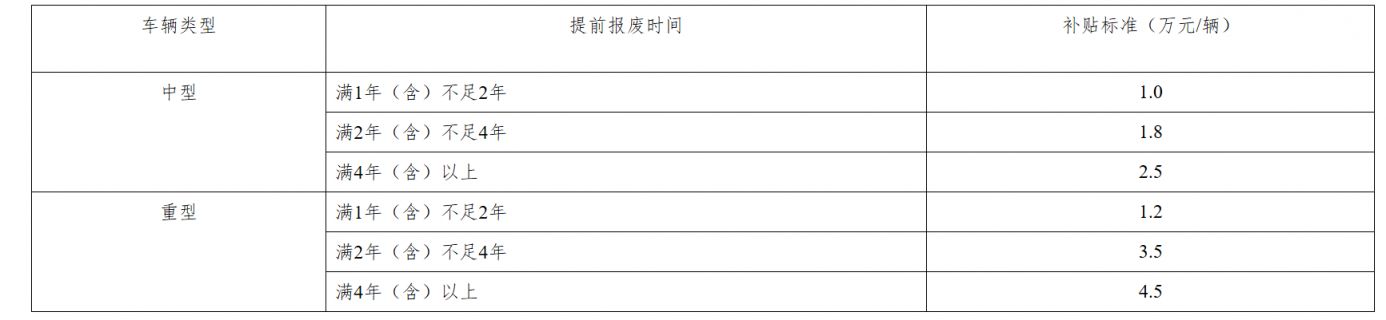 其中,新购国六排放标准营运货车或新能源营运货车补贴标准见表2。报废老旧营运货车提前报废时间不足1年的,可以申请新购营运货车补贴。