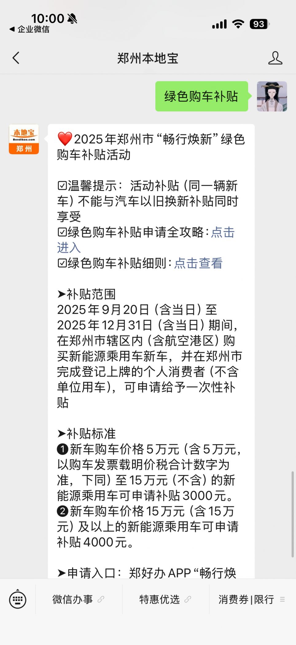 温馨提示:微信搜索关注【郑州本地宝】,对话框回复【绿色购车补贴】,即可获取郑州绿色购车补贴申请指南,包括申请条件、申请材料/入口/流程、补贴标准等信息!