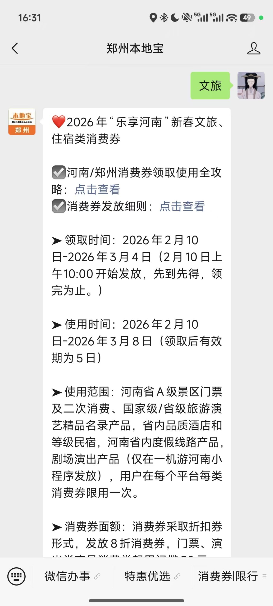 温馨提示:微信搜索公众号【郑州本地宝】,关注后回复【文旅】获取2026年河南文旅、住宿消费券发放最新消息,包括抢券入口+领取平台+抢券时间+抢券流程、使用指南、商家名单等最新信息(持续更新)